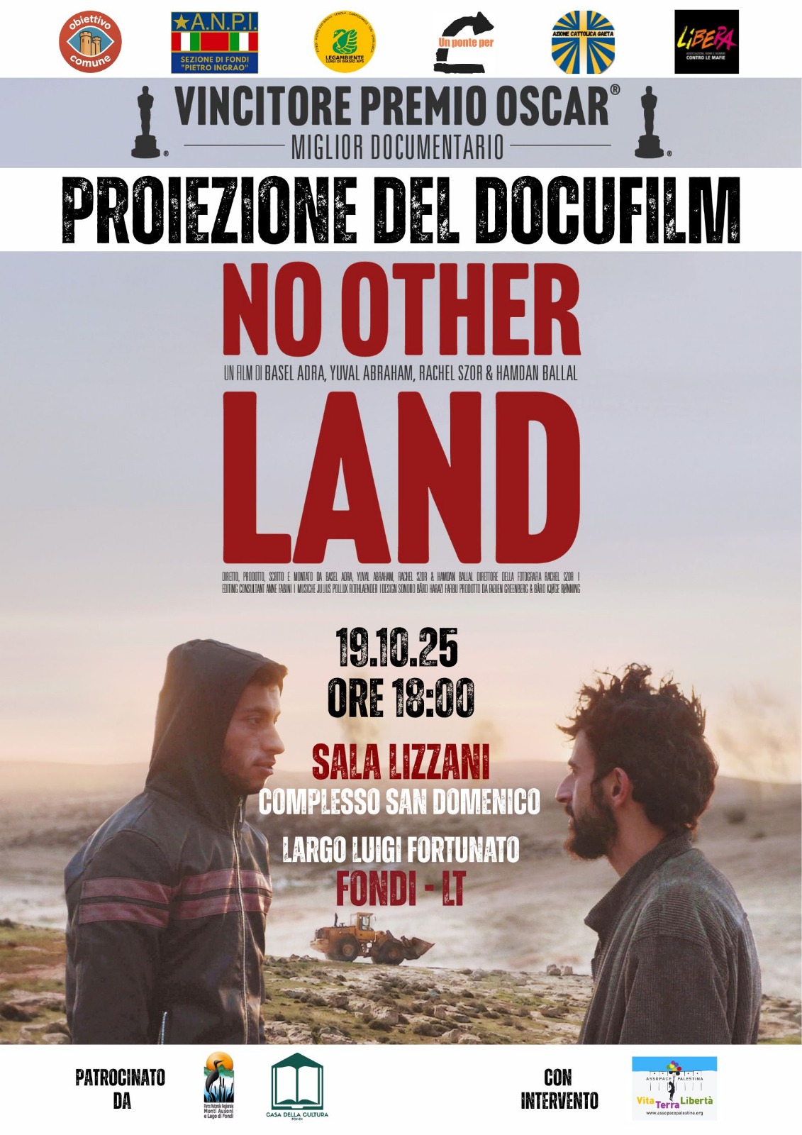 Domenica 19 ottobre, alle ore 18.00 presso la sala Lizzani, all’interno del complesso di San Domenico in Largo Luigi Fortunato a Fondi, si terrà la proiezione del Docufilm vincitore di un premio Oscar “No other land”.